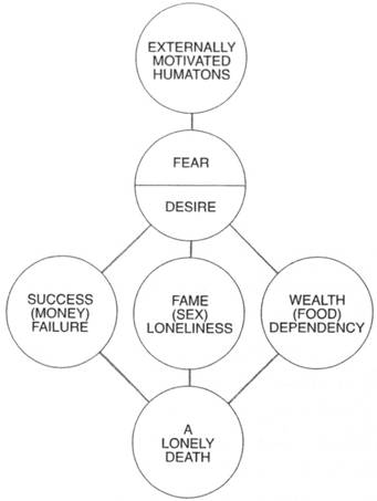In Carlos Castaneda's last work (published after his reported death), The Active Side of Infinity, don Juan introduces Carlos to the sorcerers' 'topic of topics', the existence of a dark predatory force that has enslaved humanity in order to farm it as a food source. This force, or entity, he calls the flyer, 'a predator that came from the depths of the cosmos' and took over the rule of our lives. The flyers took us over, he says, because 'we were food for them... Just as we rear chickens in chicken coops, gallineros, the predators rear us in human coops, humaneros.' Castaneda reports that these predators have given humanity its system of beliefs, its ideas of good and evil, its social mores. 'In order to keep us obedient and meek and weak the predators engaged themselves in a stupendous manoeuvre... They gave us their mind... Through the mind, which, after all, is their mind, the predators inject into the lives of human beings whatever is convenient for them.' According to Castaneda, these predators feed not upon the energy of the body (as in The Matrix) but rather 'the glow of awareness' that makes us human. They devour this 'glow' almost entirely, leaving only the smallest fraction (enough to keep us alive, just like the AIbred foetuses in their pods). The tiny residue of awareness they leave us with is the flyers' mind itself, and revolves around egomania and a blind preoccupation with the self, above all with security, comfort, food, and other material needs. Sound familiar ?