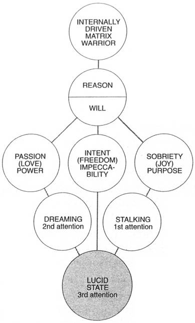 The 1st attention pertains to the matrix, the world of reason and of the intellect. It is everything that can be rationally grasped, explained, and understood (also known as the tonal). The mastery of the 1st attention is known as stalking. The world of ordinary men is upheld by reason, the world of sorcerers by will. Ordinary men have a single ring of power that spins the world into being, which we call reason. Sorcerers tap into a second ring of power, that of will.